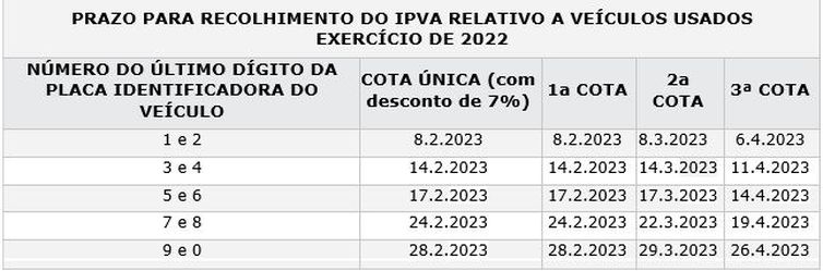 Já os que decidirem pelo parcelamento em até três cotas irão pagar a primeira prestação também em fevereiro e quitar o IPVA nos meses subsequentes, com a última parcela em abril. Para saber o valor do imposto a ser pago, basta acessar o site da Secretaria da Fazenda (Sefaz) e informar o Renavam e a placa do veículo.